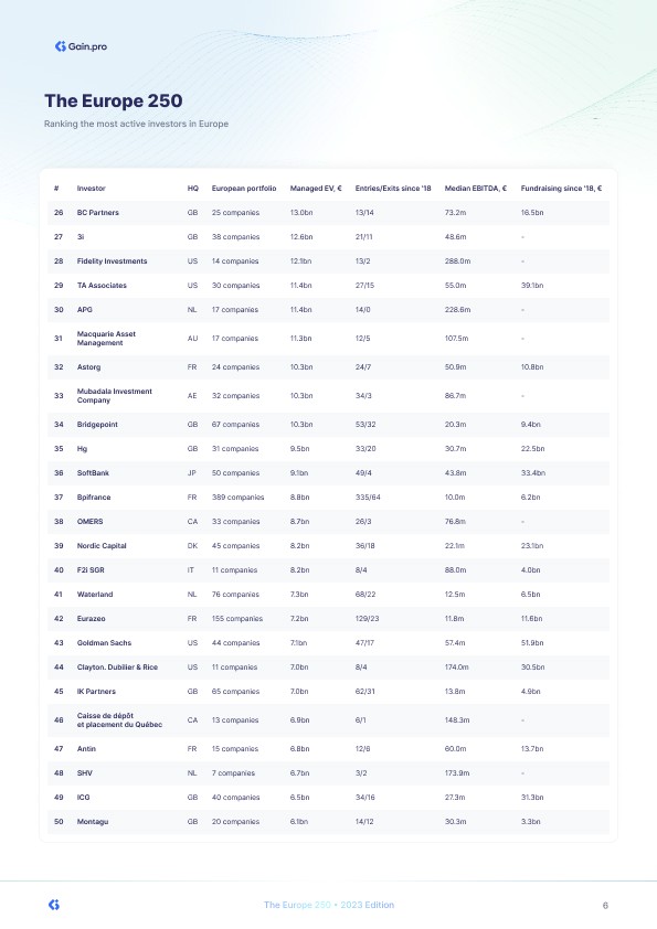 In our first edition of the Europe 250, we analysed and ranked the largest and most active investors in Europe. Our ranking is based on the size of the underlying portfolio and is calculated with a proprietary Gain.pro algorithm.