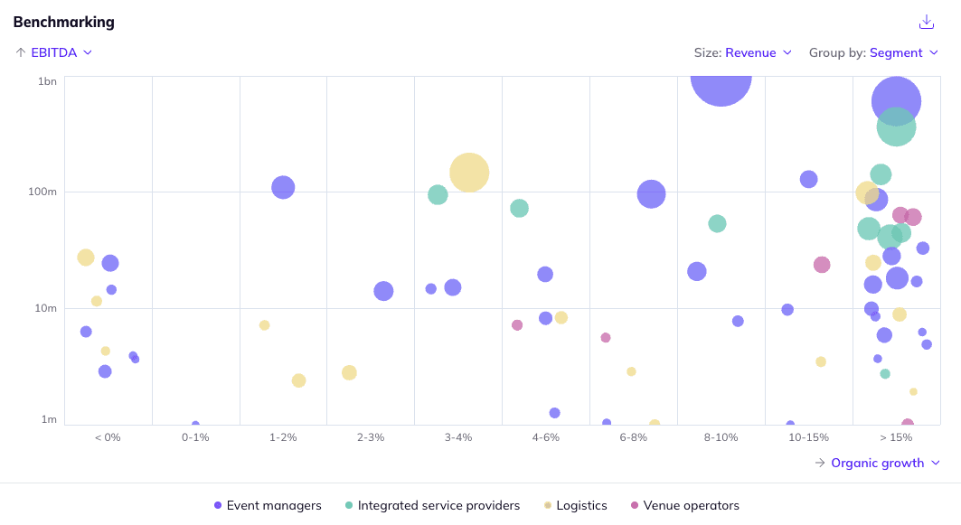 The European event and exhibition management market comprises players that organise, execute and provide logistics services for trade shows, conferences, expos, conventions and other gatherings across various industries. As such, we segmented the European market by the nature of players’ business models into: (i) venue operators, (ii) event managers, (iii) logistics and (iv) integrated service providers.