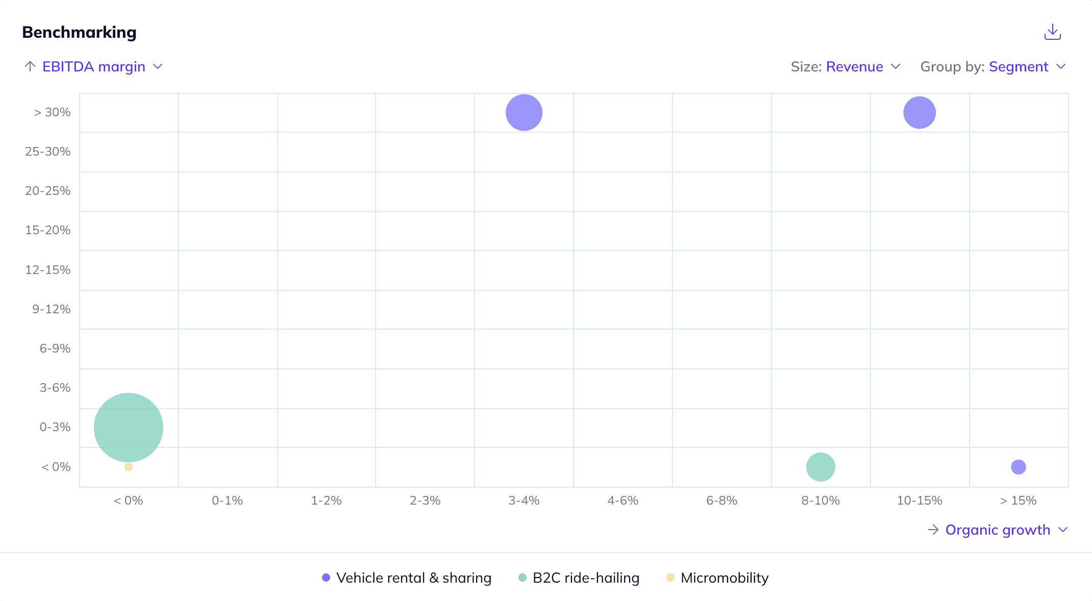 The US shared mobility market is highly consolidated and dominated by cars, with other types of vehicles playing a smaller role (expert interview by Gain.pro, January 2025). Specifically, the ride-hailing segment is dominated by Uber and Lyft, with Uber holding ~76% of the 2024 US B2C ride-hailing market share in terms of value. Similarly, the US car rental market remains highly concentrated, with the top 3 players, Enterprise Mobility, Hertz and Avis Budget Group, controlling ~90% of the total US car rental market. When zooming in on the micromobility segment, Lime and Third Lane Mobility (through Bird) hold a combined ~60% market share in the US. These large players continue to expand their presence through strategic partnerships (e.g. vehicle OEMs) and by investing in emerging technologies (e.g. electric autonomous vehicles). At the same time, the long tail typically focuses on a particular niche or geographical location (e.g. Outdoorsy caters to the RV rental services niche) to differentiate itself.