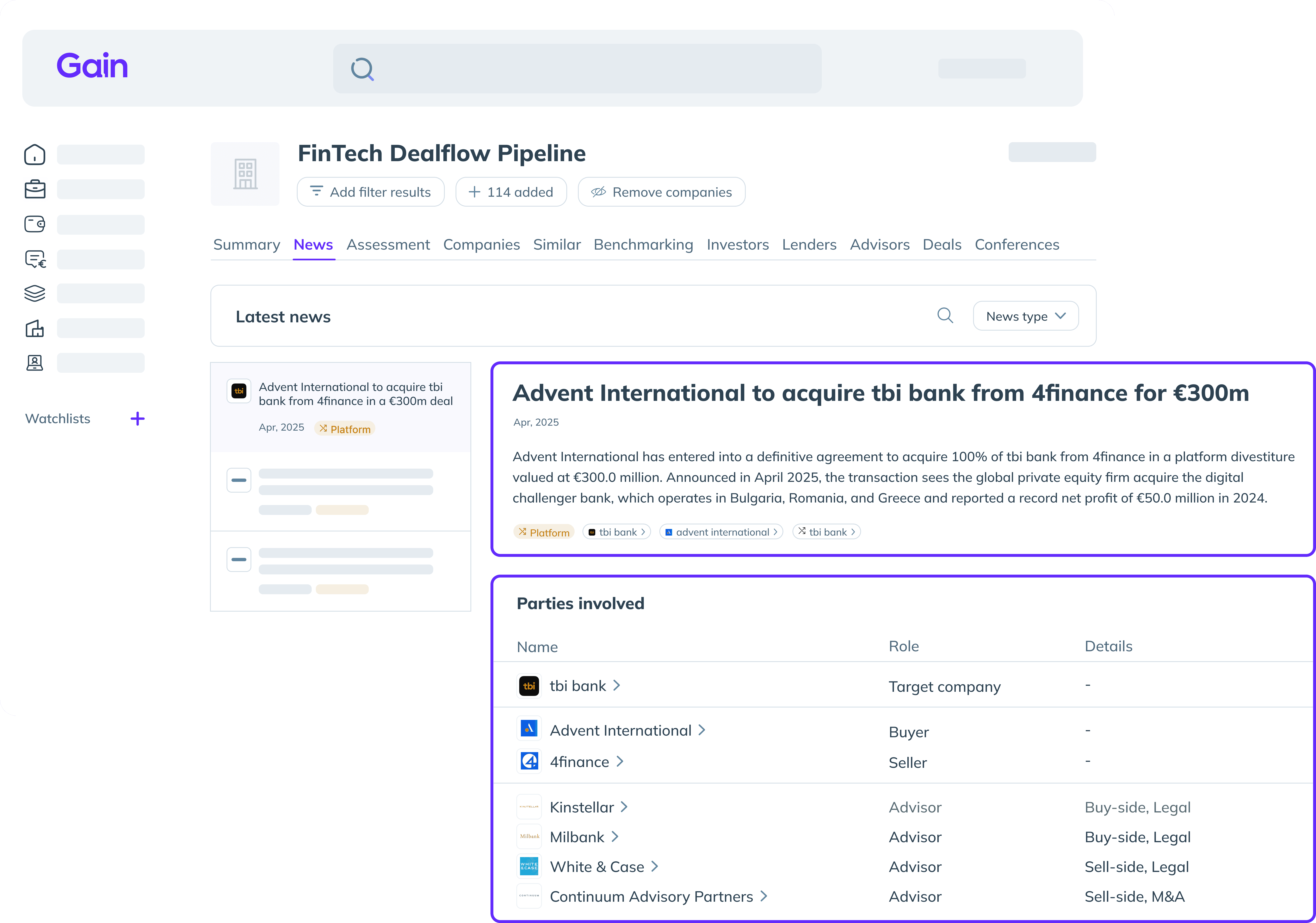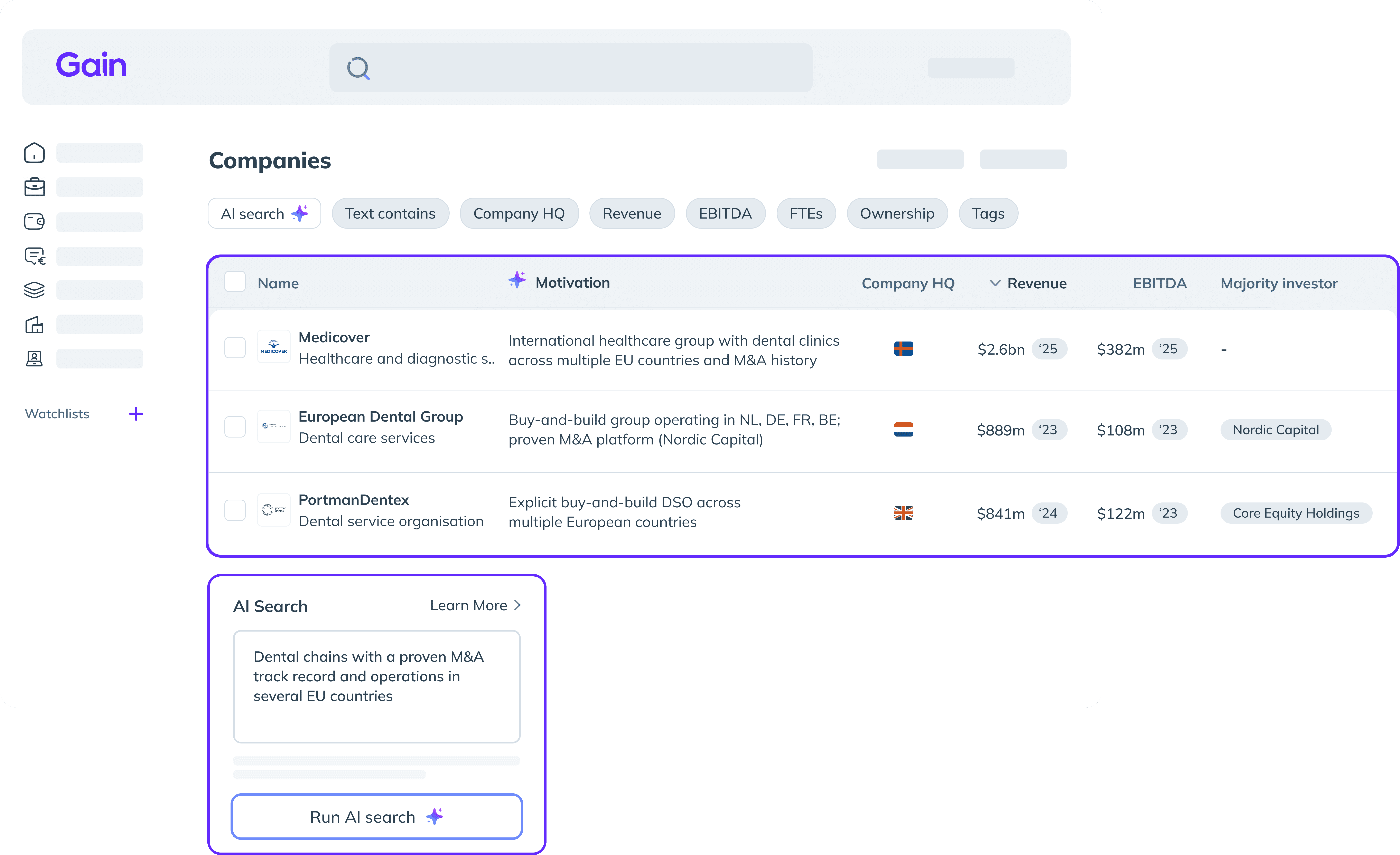Gain uses AI to continuously track activity across your target universe, surfacing changes, risks, and new opportunities, while analyst-verified profiles create a living pipeline you can move on with confidence.
